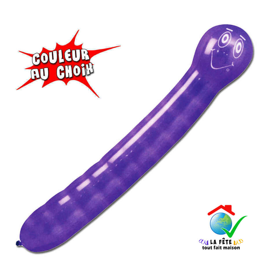 Ballon forme personnage saucisson chenille, couleur au choix, prix unitaire, conditionnement vrac. À gonfler de préférence avec une pompe (non fournie) sinon à la bouche. 100% latex naturel = 100% biodégradable ! On peut ainsi faire un lâcher de ballons sans risque de polluer.