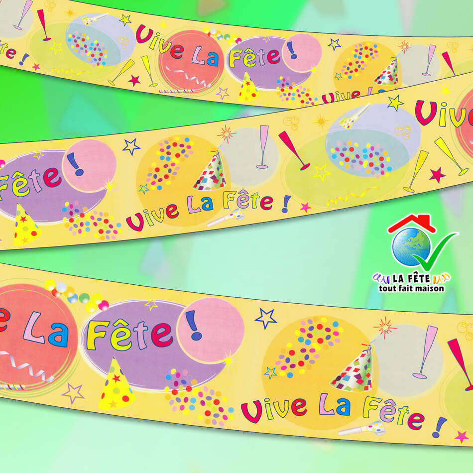 Bannière portant l’inscription « vive la fête », colorée et joviale, elle sera du plus bel effet, à fixer à l’aide de punaises, (matière carton glacé, hauteur 16 cm, longueur 2,44 mètres, imprimée sur une seule face, prix unitaire).
