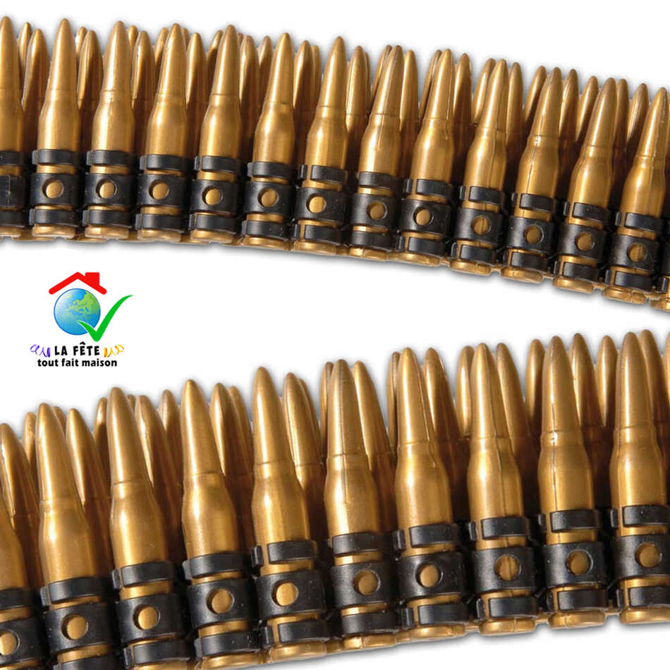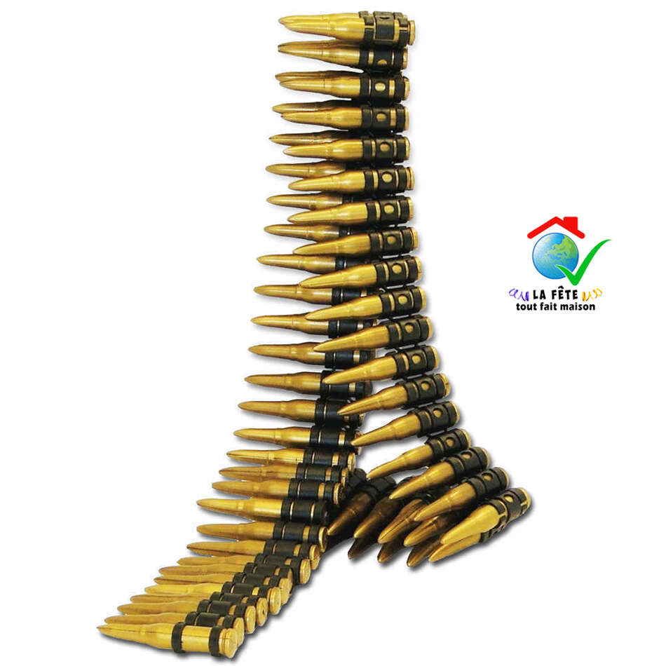 Matière plastique, longueur 1,60 mètre, entièrement démontable, contient 95 munitions environ, indépendantes et amovibles chacune de longueur 7 cm et d’un diamètre à la base de 1,3 cm (13 mm), très belle imitation, effet réaliste.