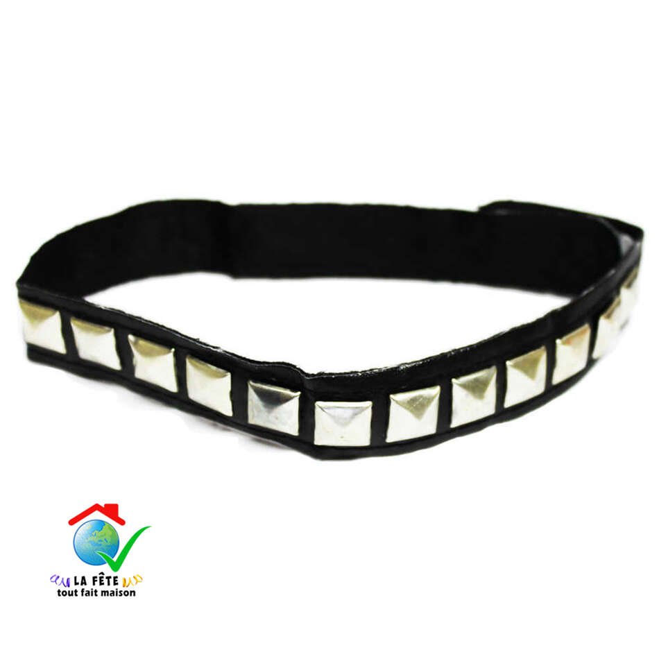 Collier avec un rang de studs métal, largeur 2,5 cm, longueur 42 cm, fermeture par bande velcro, accessoire mixte : homme ou femme, taille unique adulte / adolescent.