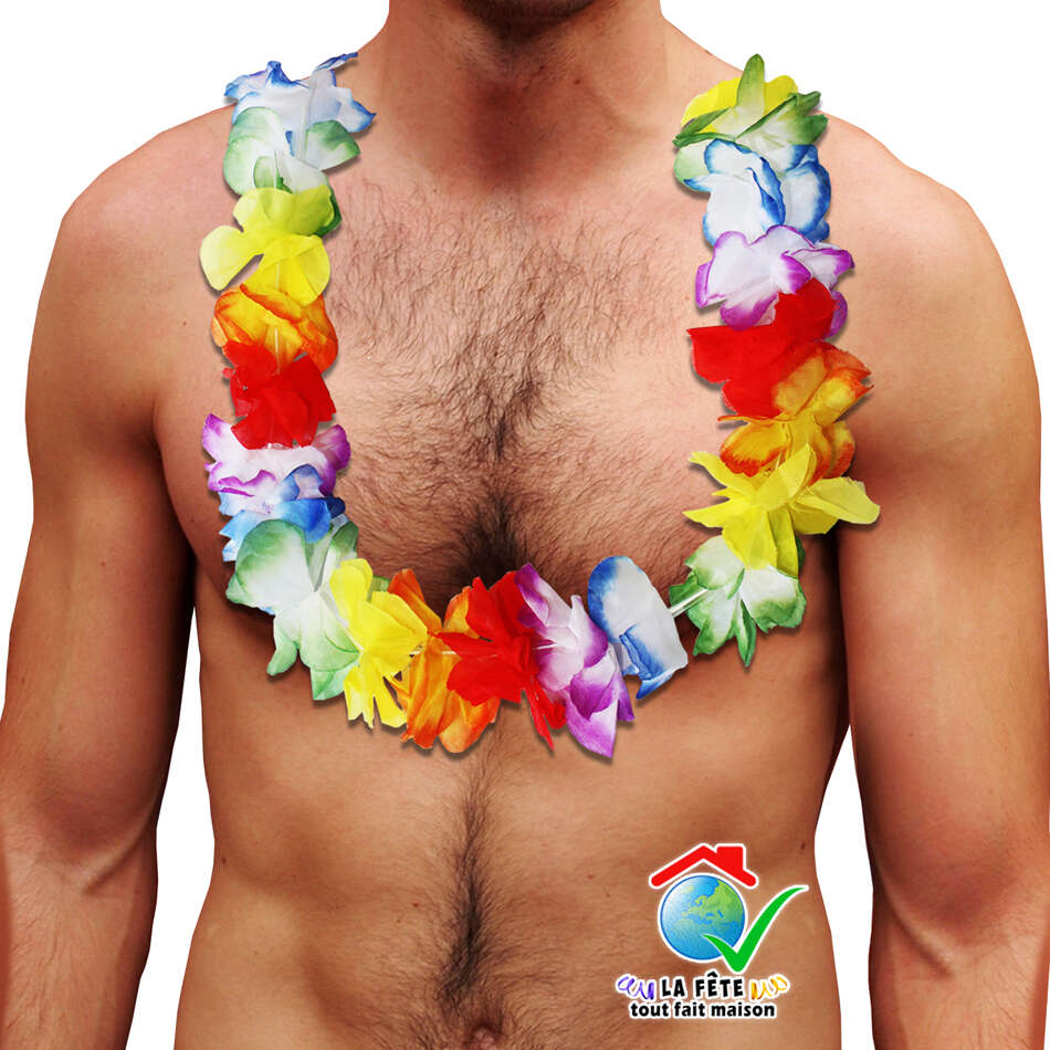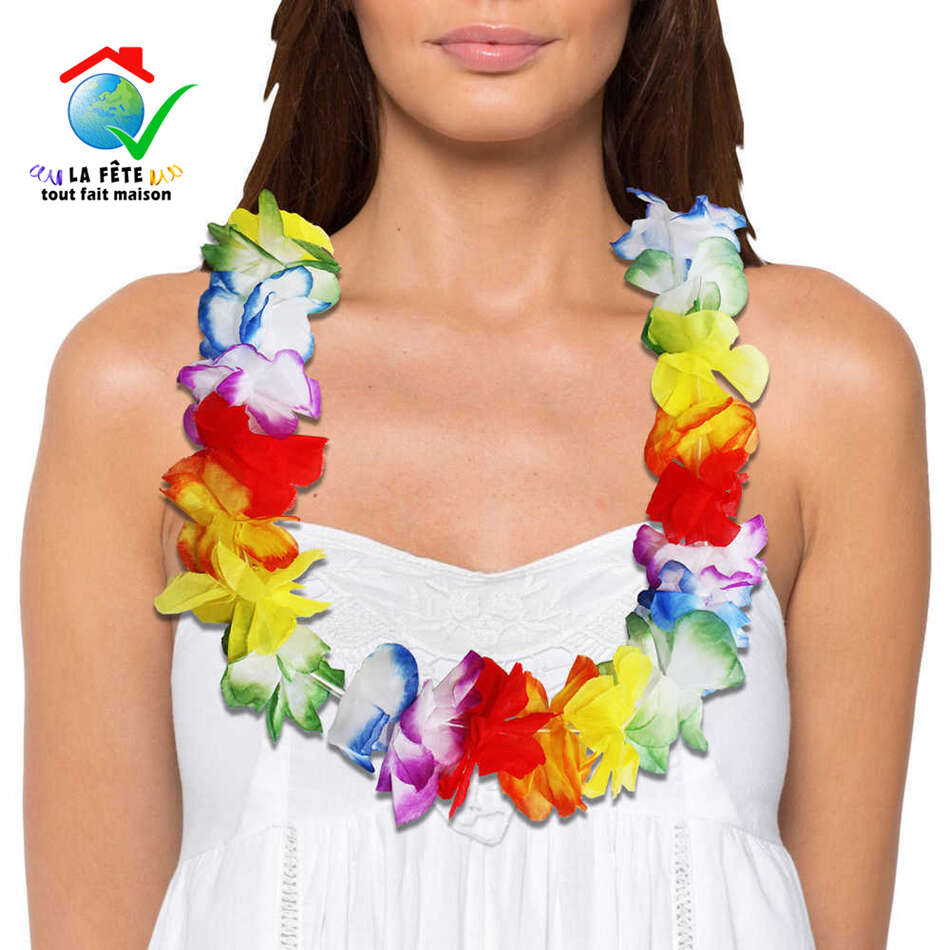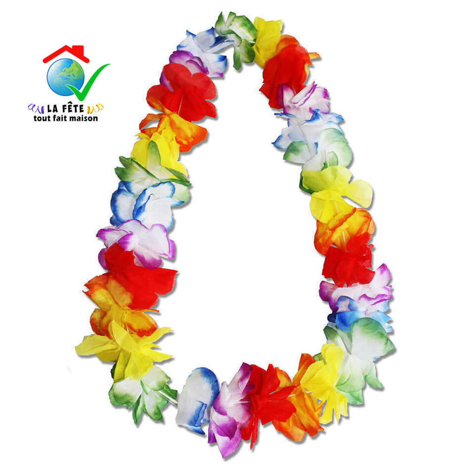 Collier hawaii à fleurs artificielles multicolores, tissu synthétique, ne craint pas l’eau. Taille unique adulte / adolescent. Longueur collier 90 cm environ, (pend du cou de 36 cm).