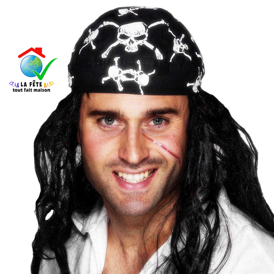 bandana de pirate à têtes de morts foulard bandeau madras carré de tissu noir et blanc corsaire flibustier jack sparrow capitaine crochet bandit squelette accessoire de déguisement
