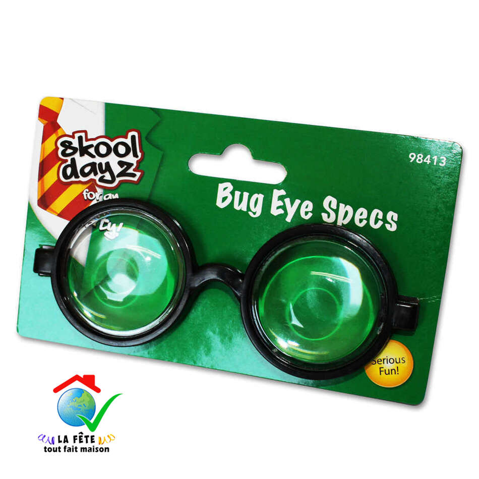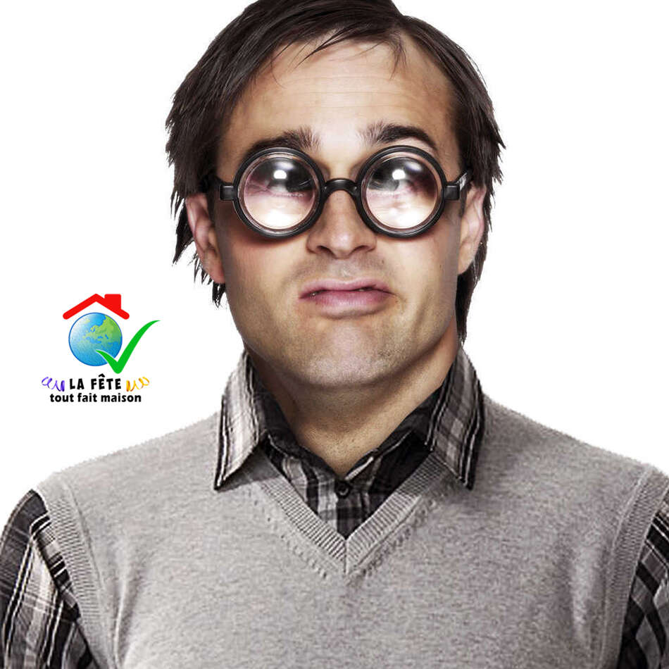lunettes à effet loupe accessoire de déguisement débile louche benêt culs de bouteille premier de la classe coincé timide faible chétif nigaud andouille ballot bête sot niais imbécile stupide idiot cruche balourd gourde cornichon âne lourdaud
