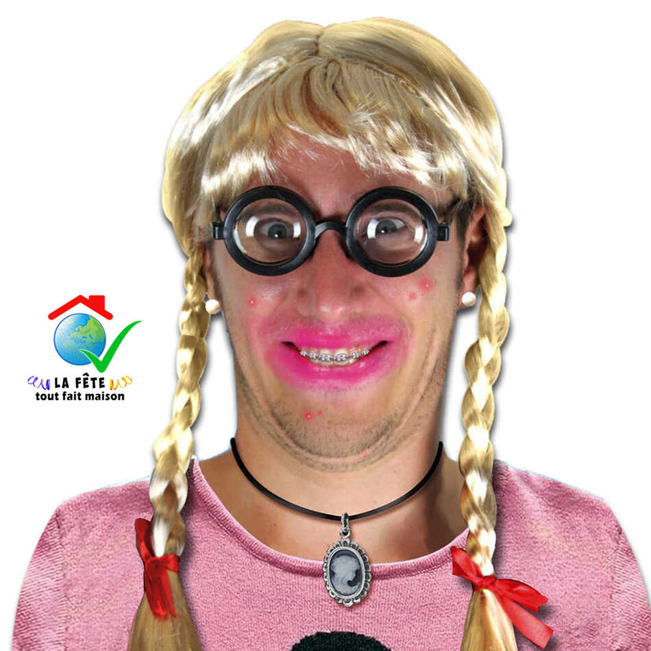 perruque betty blonde platine couettes nattes noeuds rouges cageot pauvre fille moche pot de colle laideron gamine amoureuse copine charme drague enfant cageot boutonneuse