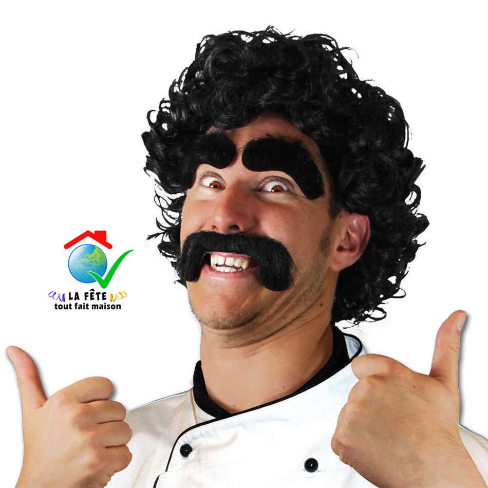 perruque momo le turc arabe beur borat mohamed musulman chanteur ringard frisé boucles brune postiche accessoire de déguisement déguiser kebab kébab kazakhstan maghrébin marocain tunisien algérien basane halal
