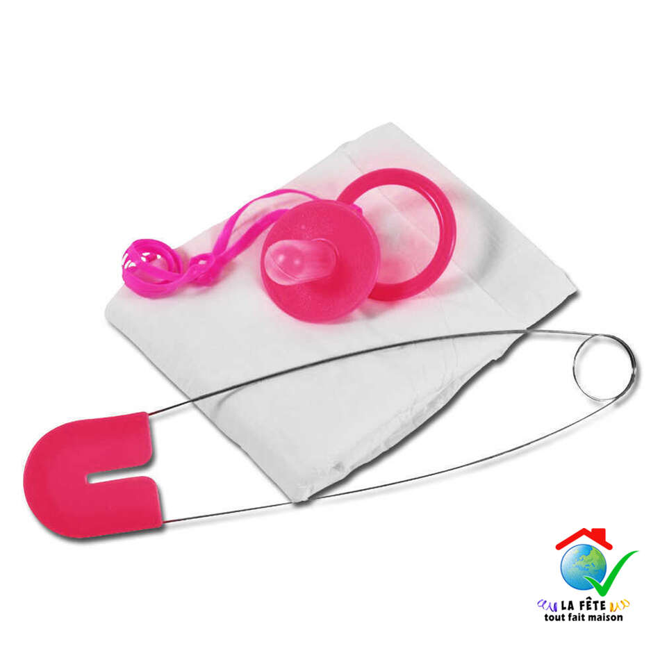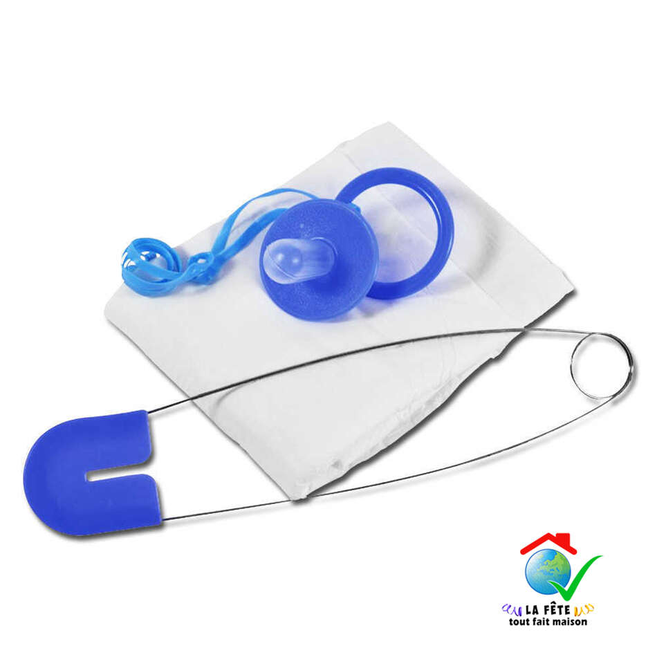 Set de déguisement de poupon complet pour adulte comprenant une couche-culotte, une tétine et une épingle à nourrice géante ouvrable. Modèle au choix : bleu pour les garçons ou rose pour les filles, prix unitaire.