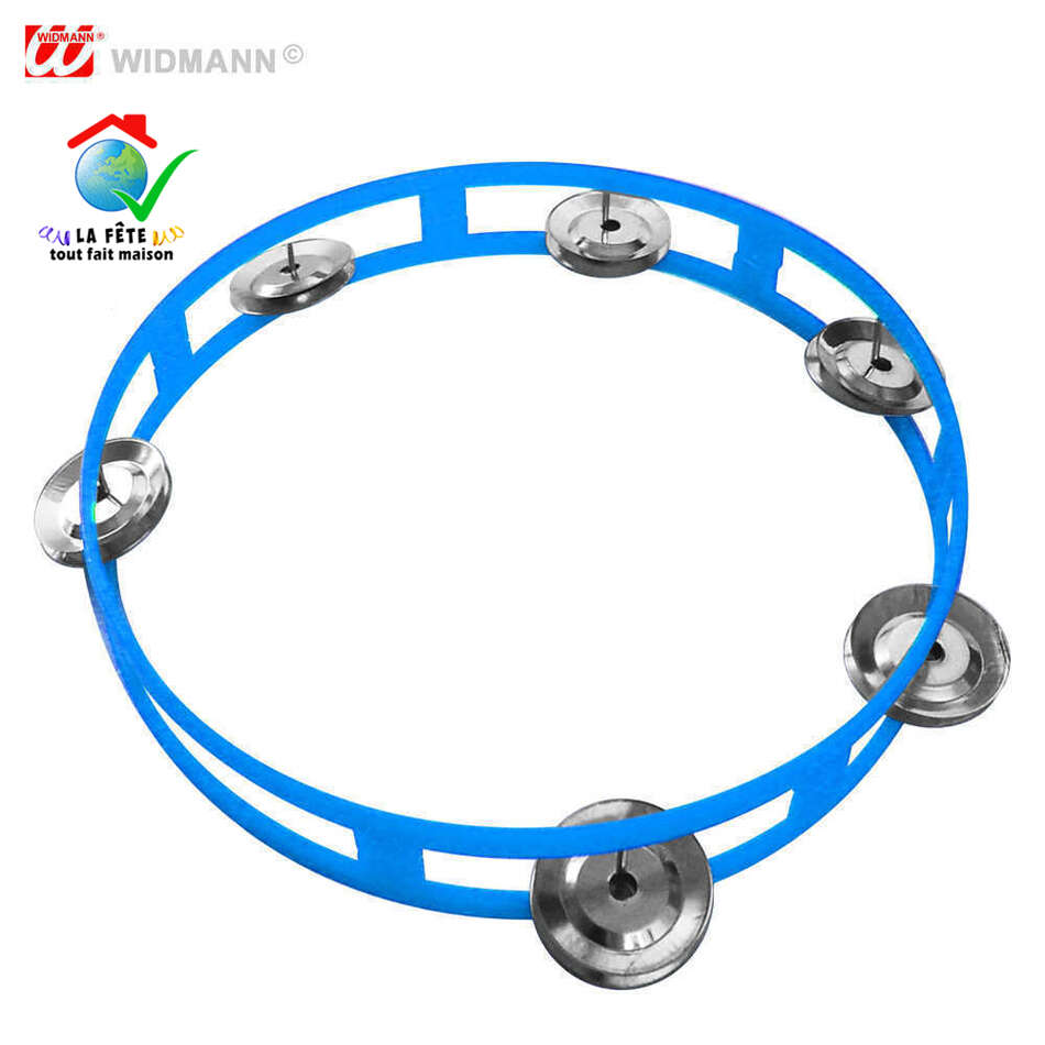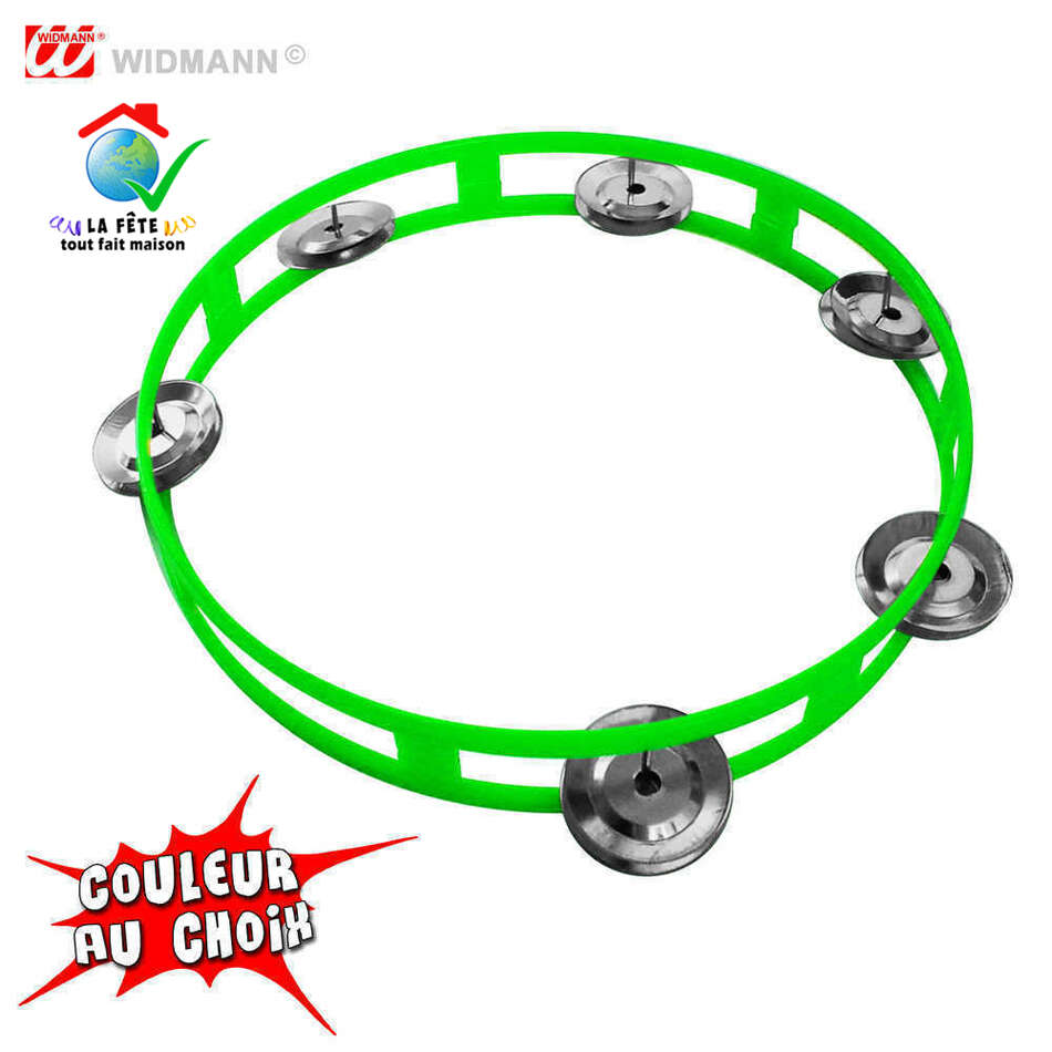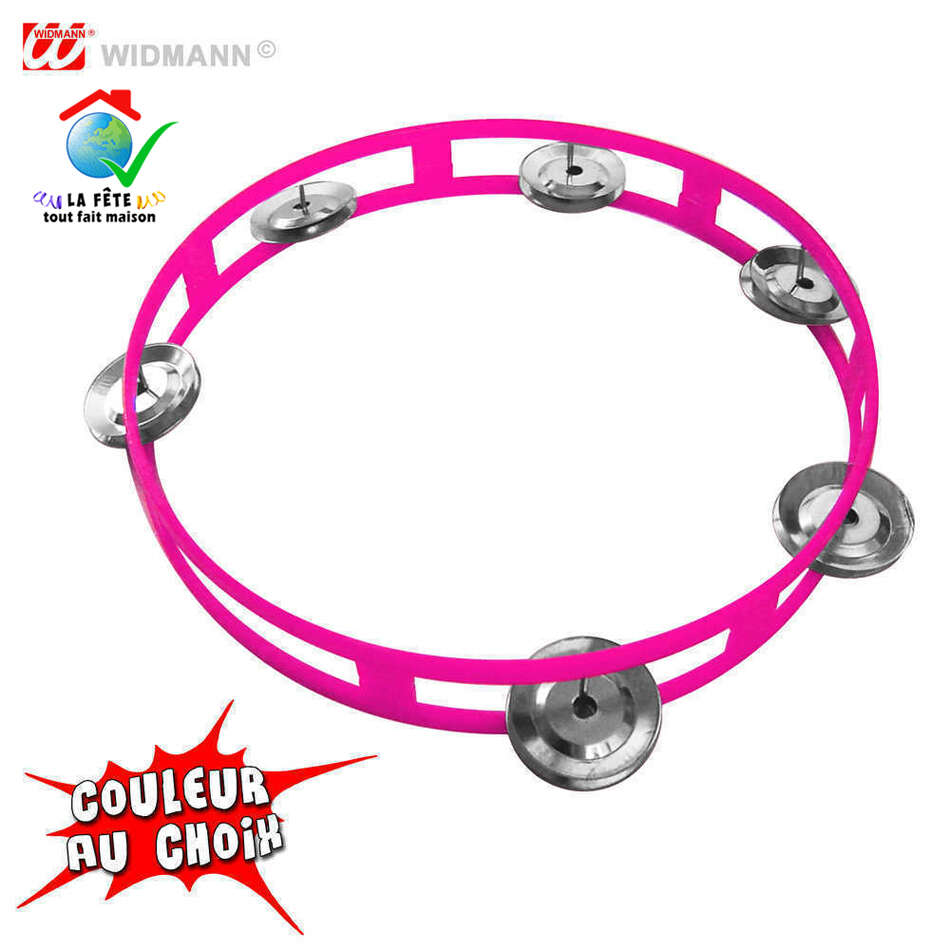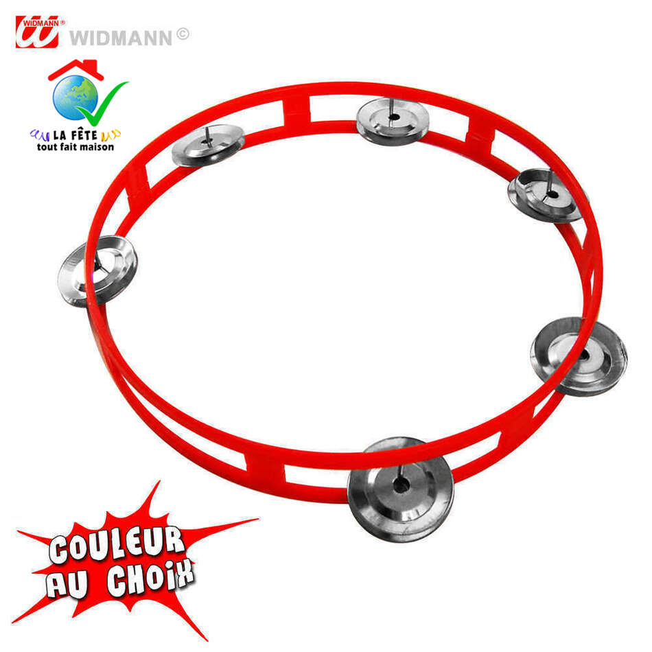 Tambourin plastique évidé discount, muni de cymbalettes métalliques, instrument de percussion véritable, épaisseur 3,5 cm, diamètre 25 cm, coloris au choix, prix unitaire.